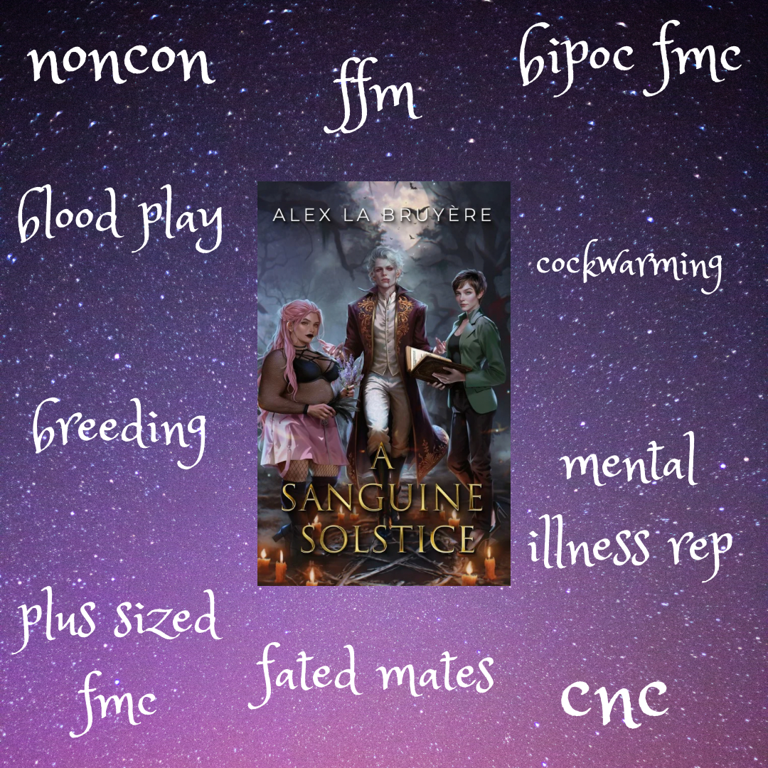 A Sanguine Solstice is an FFM dark paranormal comedy with a why choose HEA. Please review the notes in the front matter or on the author’s website. If you have any questions regarding any content, please feel free to contact the author for more information.