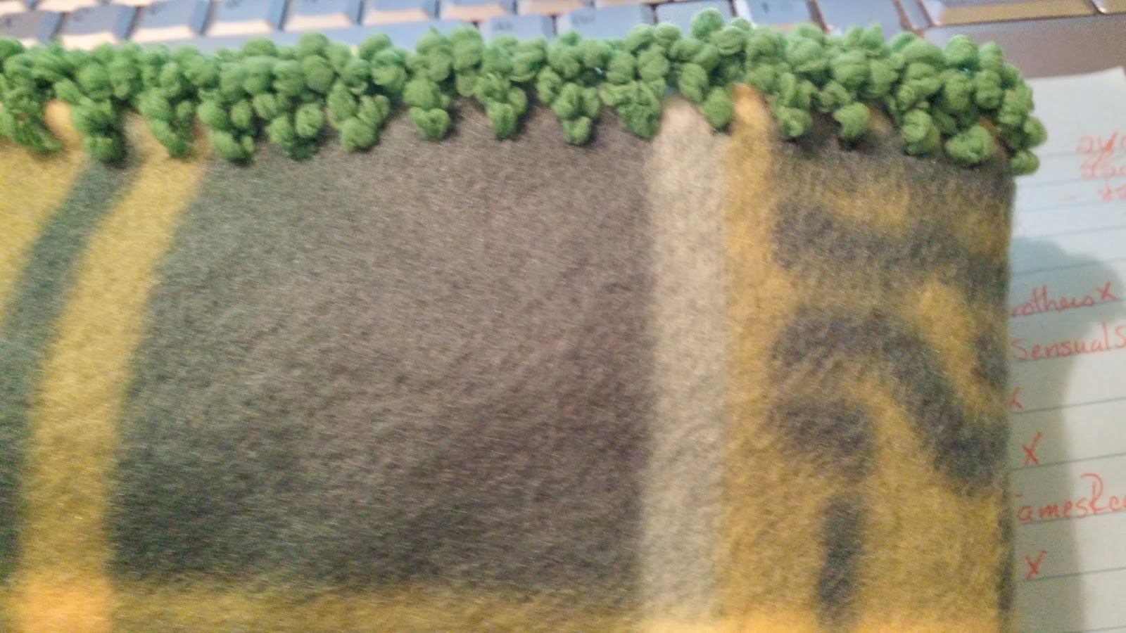 The blanket is fleece – Packer pattern – which I crocheted around with some funky yarn. I think the edging turned out nicely and I’m pleased with the result. Believe it or not, this is a simple single crochet around the blanket. It’s the yarn that makes the funky pattern.