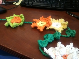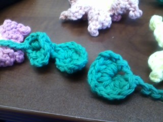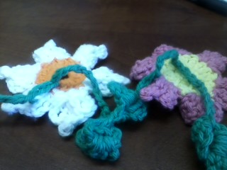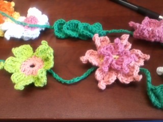In the book the flowers are put together with fishing line so they look like they are floating. I joined mine together with green chain so it looks like a vine. I could have just done a simple chain but that seemed a bit boring. Instead I played with a leaf pattern. I was going to try to make a triangle type leaf but the few things I tried I didn’t like. As I was playing with the design I realized it would be easy to use the Crocodile Stitch for leaves. In the picture below you can see where I did just chaining and then a different spot where I put four crocodile stitches in a row. These four were worked directly above each other.