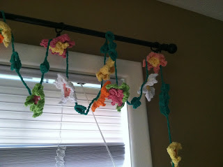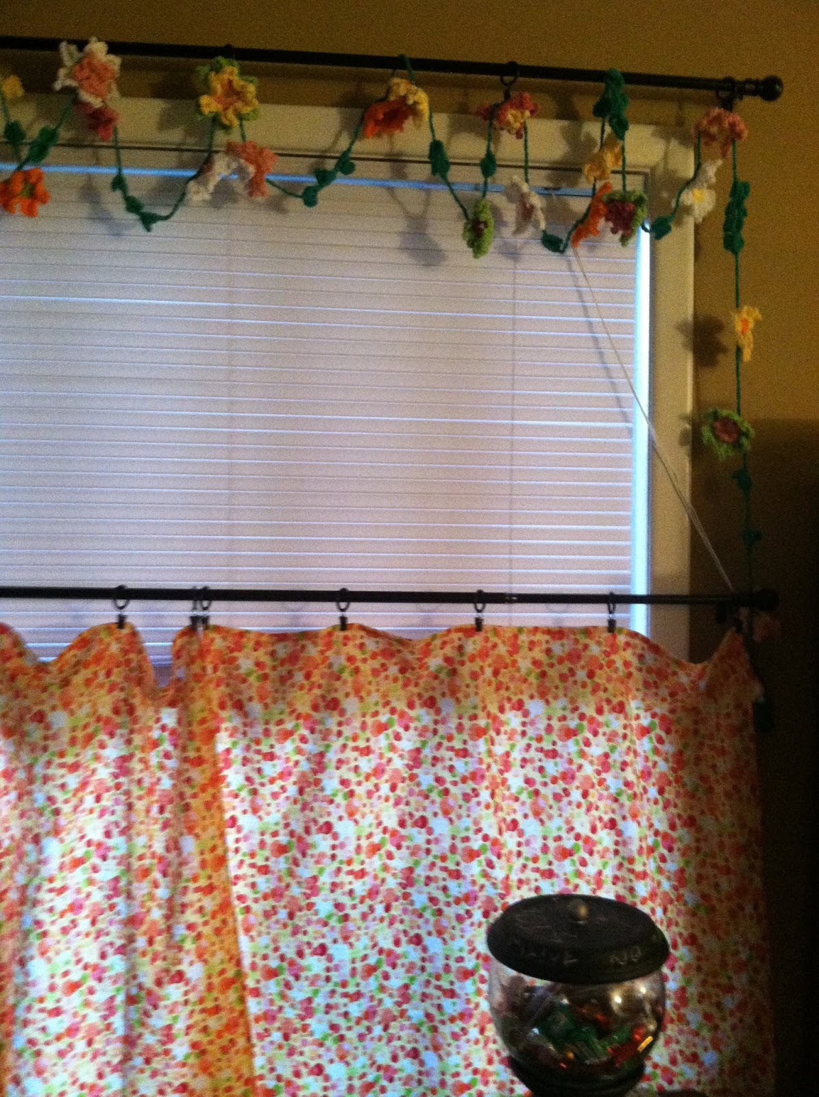 I finally finished the valances for her two windows in her dining room. I made 62 flowers of 4 different designs. These were quick little flowers which took very little time to make but they are quite fun. The one on the left (peach petal with white smaller petals and orange center) is an adaptation from the patterns because I wasn’t thrilled with how the third style (yellow/green petals peach center) worked up and looked. I ended up doing two of this style and they are the center flower for each of the valances.