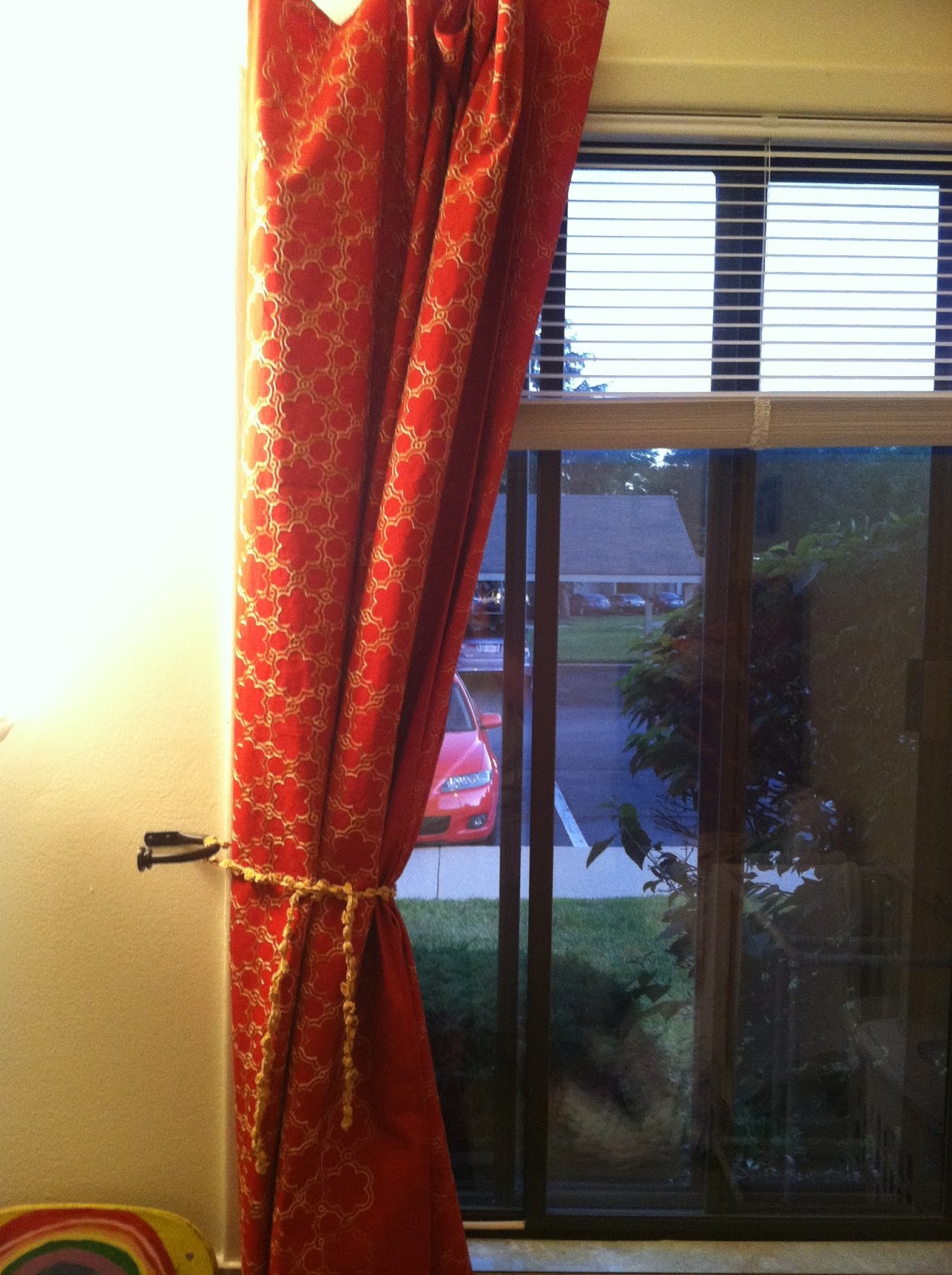 Here is her bedroom curtain tied back: