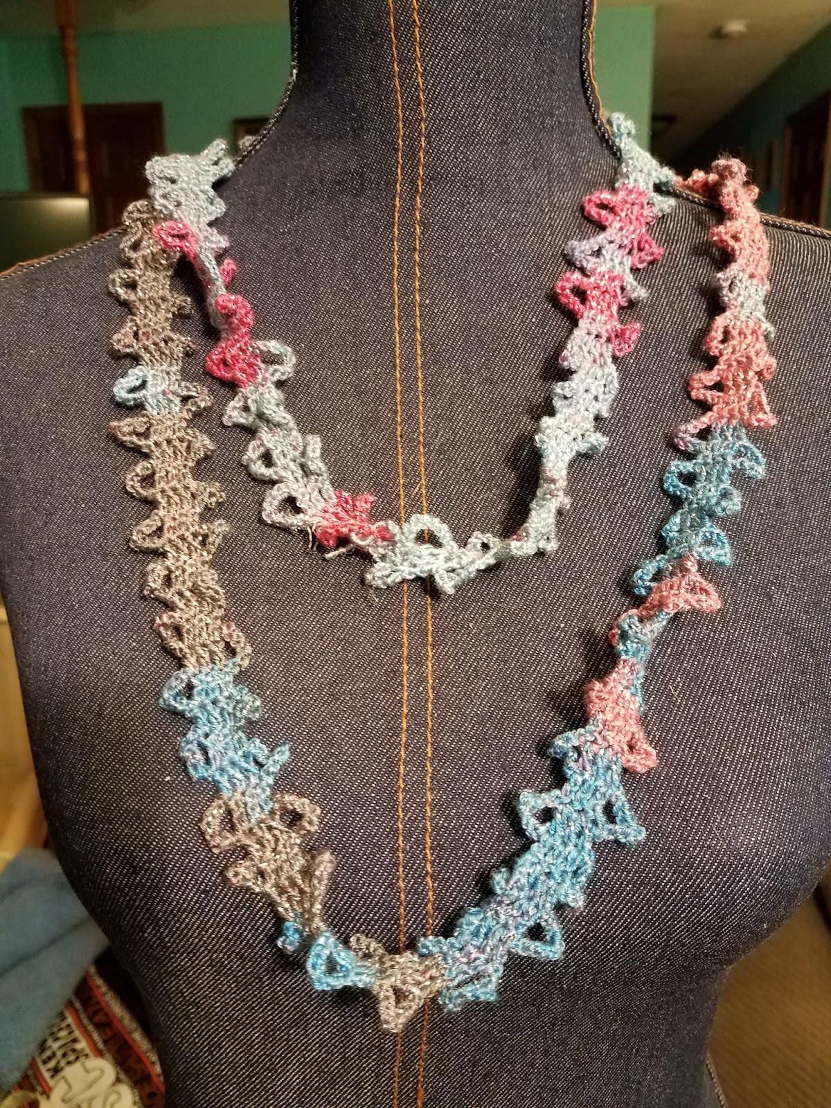 The blue scarf isn’t done yet though I’m close. It is baby yarn that will make a nice light weight scarf for spring / summer / fall. I still need to get some length on it but I’m pleased with how it is working up.