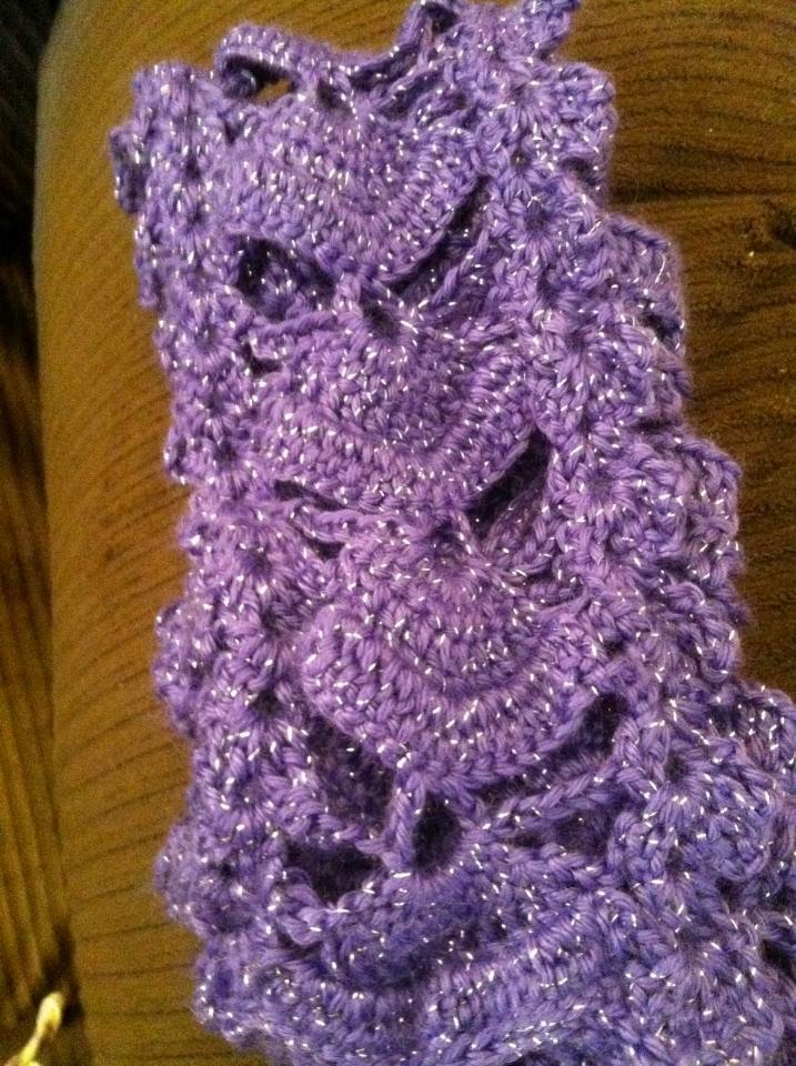 I’ve been playing with lace patterns. I’m not big on working with thread so I’ve been using different threads to make lace projects. One of them was a lace purple sparkle scarf which I gave to Vicki on Friday: