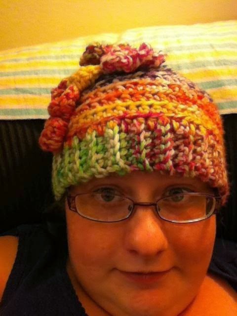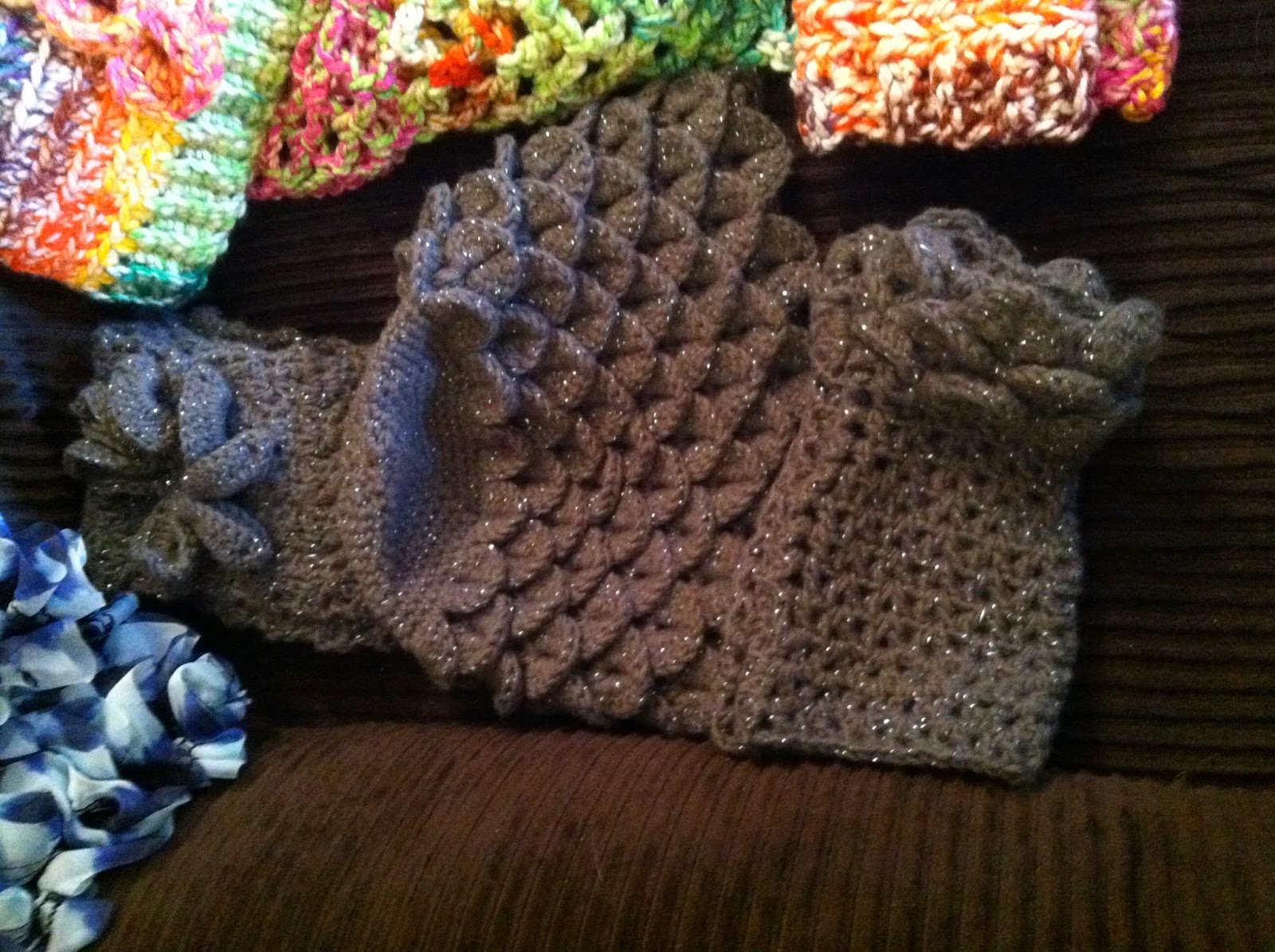 After the crayon box yarn, I picked up the shimmer yarn. Oh that turned out BEAUTIFULLY! Vicki’s favorite stitch is the crocodile stitch and I had that book with me so I handed it to Vicki and told her to pick out a hat pattern. The crocodile stitch is a yarn eater and she picked two patterns. I ended up making her one of the hats in the book. I also made a scarf and added the flower from the hat pattern to the scarf. I also made her wristers using crocodile stitches and the stitch from the scarf.